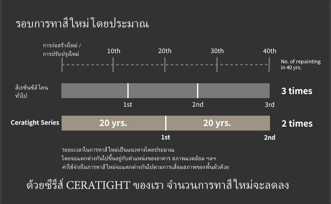 ด้วยการใช้ผลิตภัณฑ์ที่มีความทนทานและทนต่อสภาพอากาศสูง เช่น ซิลิโคนเรซินและสีที่มีฟลูออรีนเรซิน ความถี่ในการทาสีใหม่จึงสามารถลดลงได้ ซึ่งมีส่วนช่วยในการอนุรักษ์ทรัพยากรและลดของเสีย ในขณะเดียวกันก็ช่วยลดต้นทุนได้ในระยะยาว ช่วยให้สามารถรักษาอาคารได้ในระยะยาว ป้องกันการปฏิบัติงานเรื่องเศษซากและการก่อสร้างที่มากเกินไป
